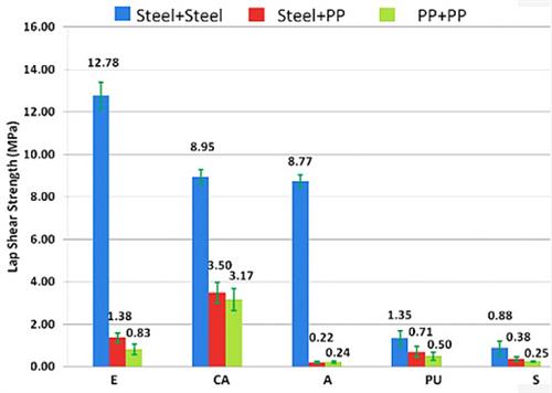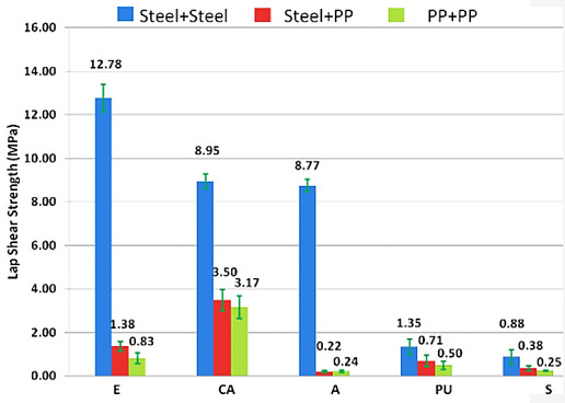 在金屬與金屬的結(jié)合中,所有的5項(xiàng)測(cè)試均可進(jìn)行。而對(duì)于金屬與聚丙烯、聚丙烯與聚丙烯的結(jié)合,則只能進(jìn)行剪切應(yīng)力測(cè)試。實(shí)驗(yàn)中對(duì)每種底層材料與粘結(jié)劑的結(jié)合均準(zhǔn)備了5個(gè)樣品。