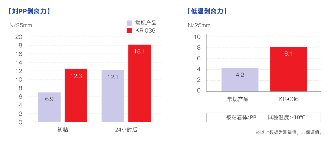 | KR-523 PW/無紡布 | 0.13 | 19.5 | 高溫及低溫環(huán)境作業(yè)下的粘性良好 |